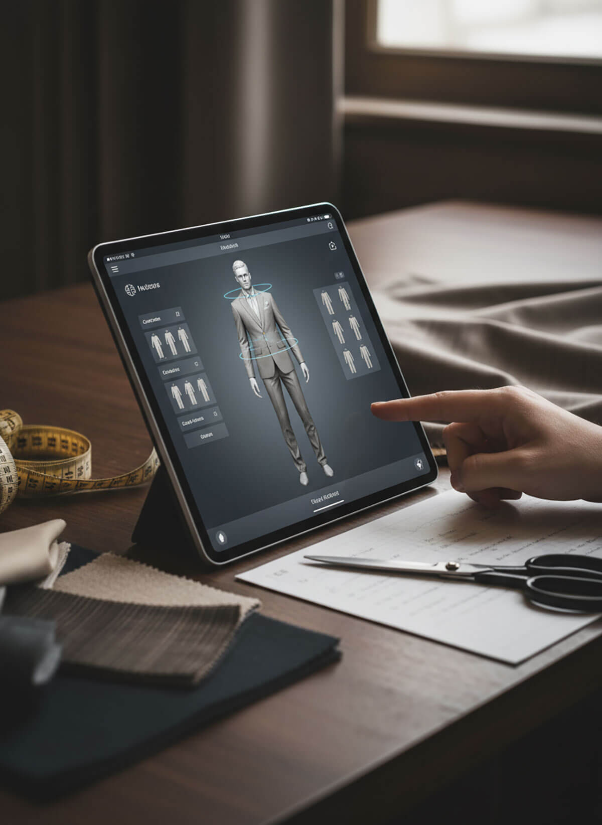 Grâce à notre outil d’intelligence artificielle dédié, visualisez en temps réel le rendu de votre tenue sur mesure et explorez les tissus, coupes et finitions avant même la création.